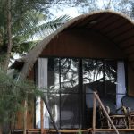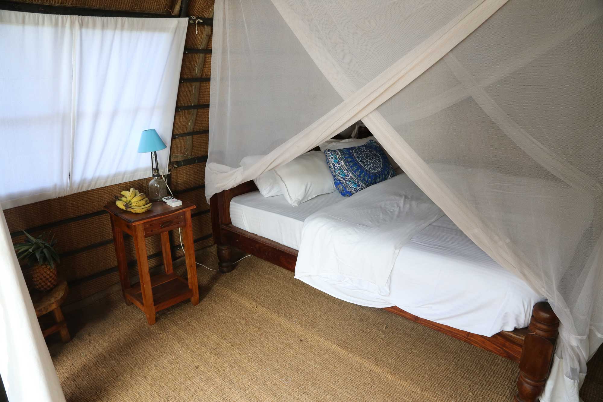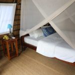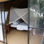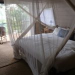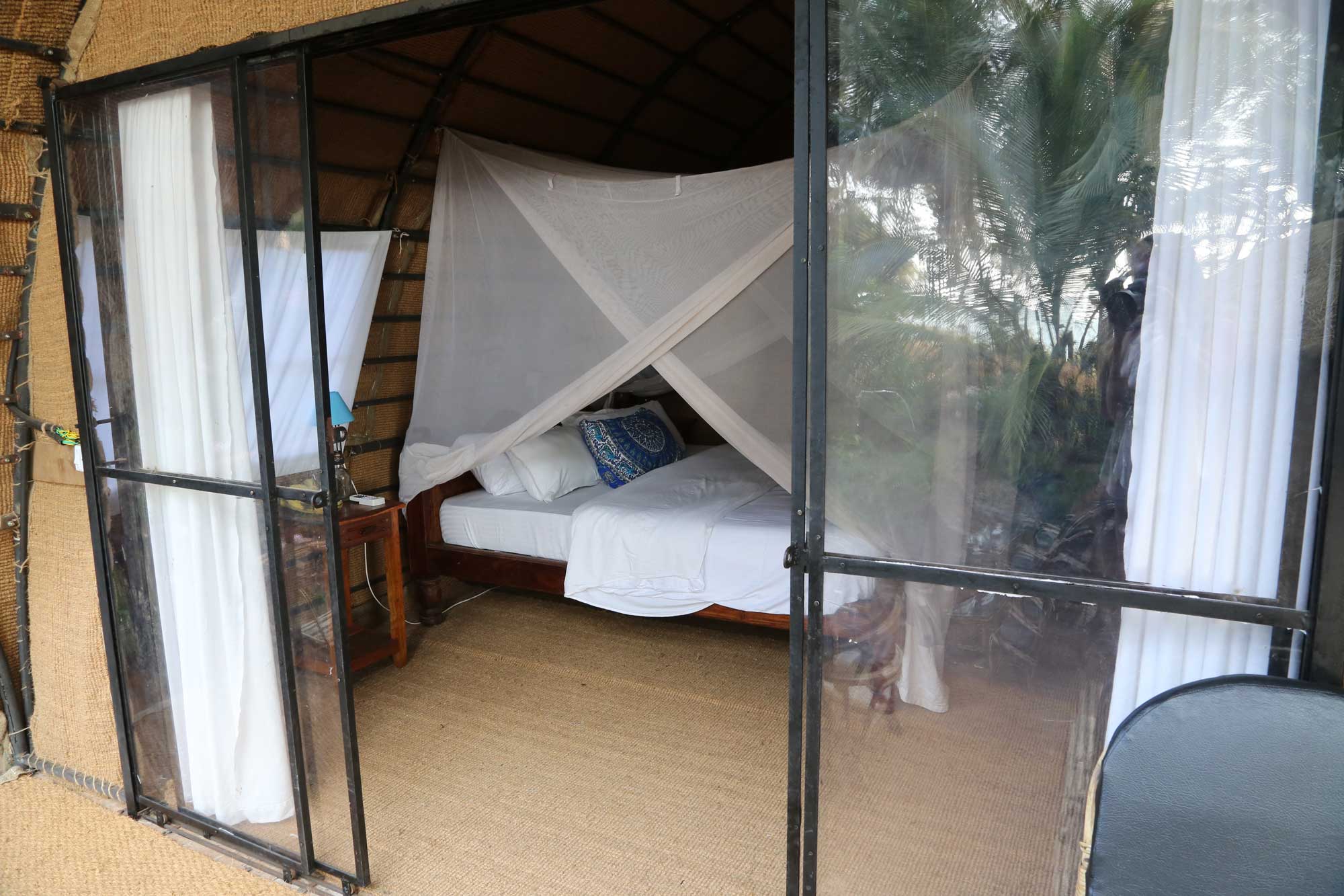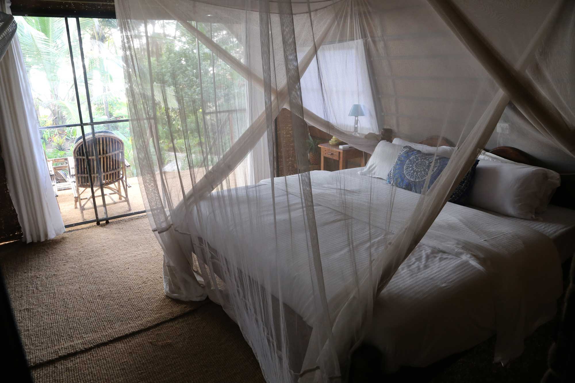 Room includes oversized double bed, mosquito net, AC, reading lamp, veranda with chairs.