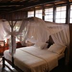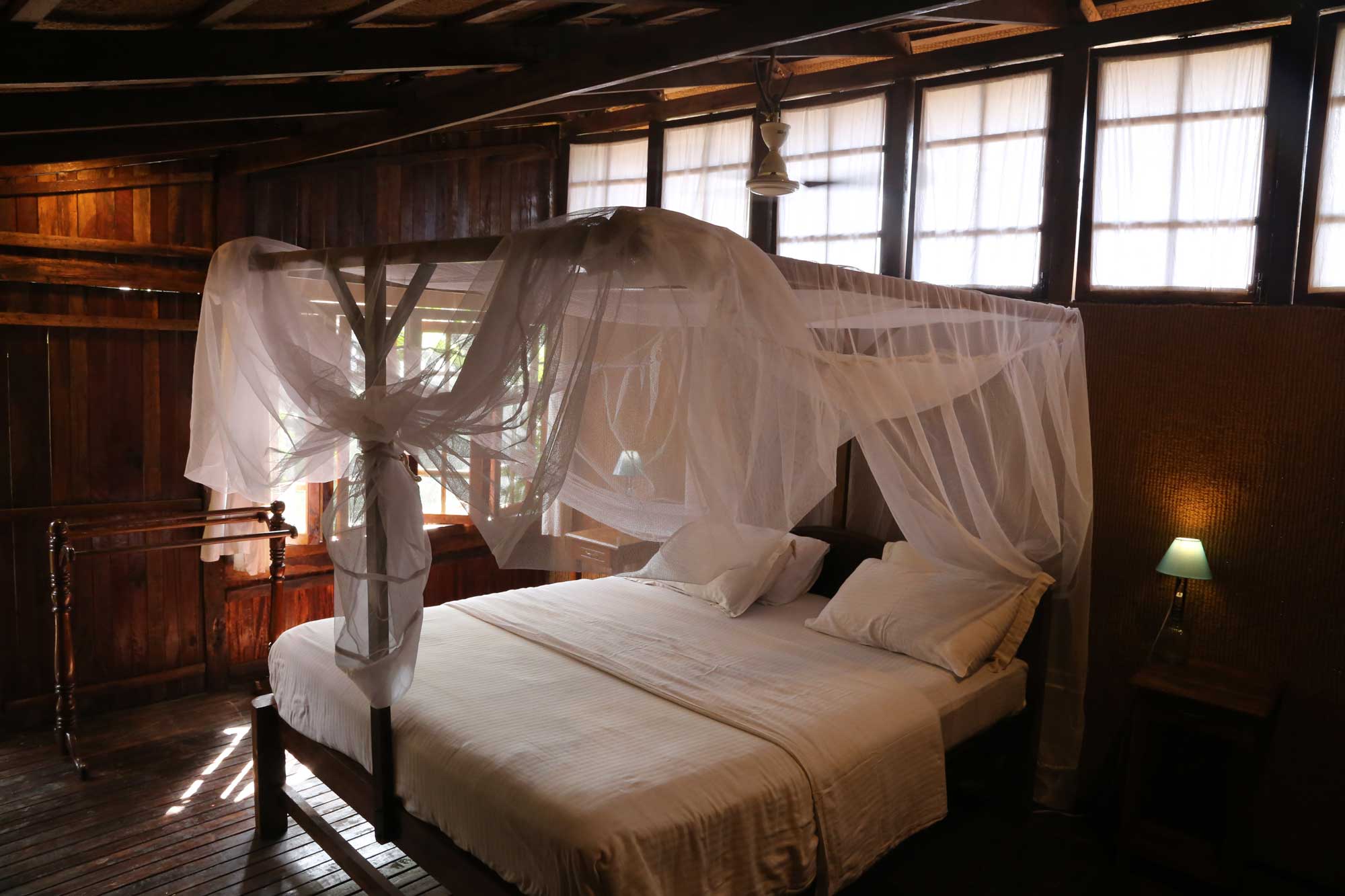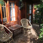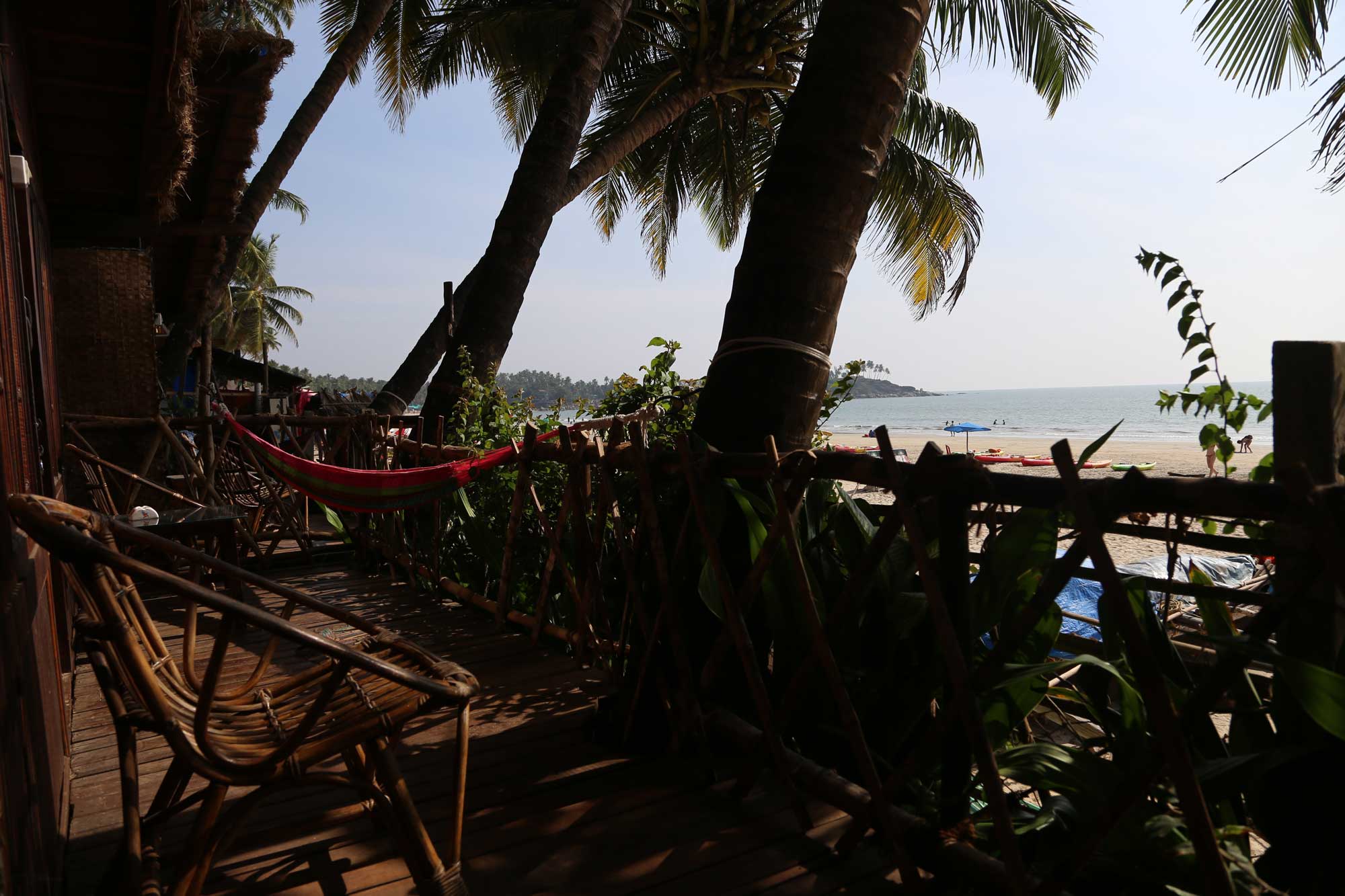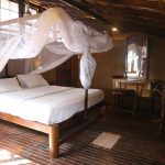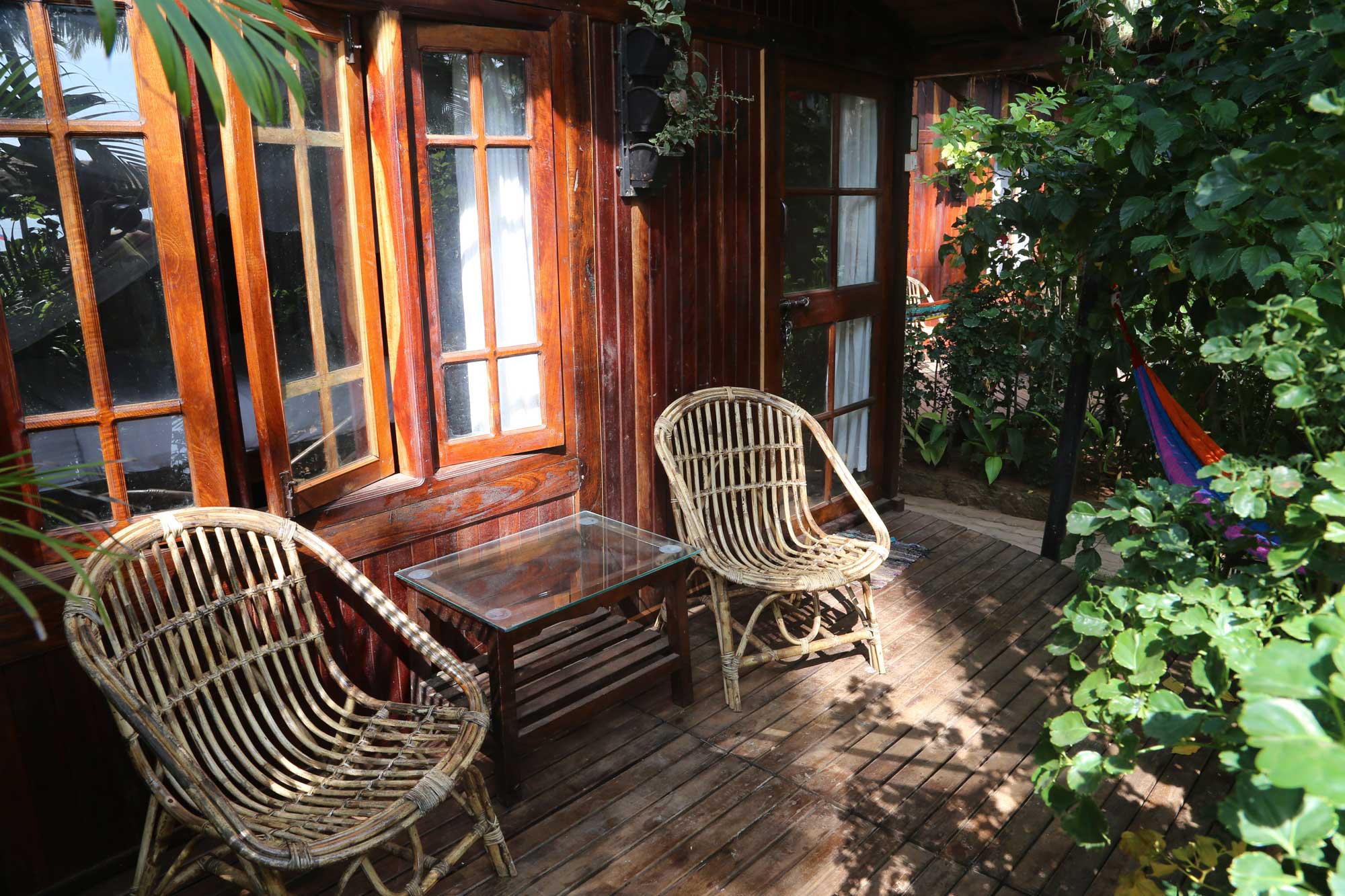 Double huts with en-suite bathroom, outdoor ground level veranda seating area overlooking the beach and sea.